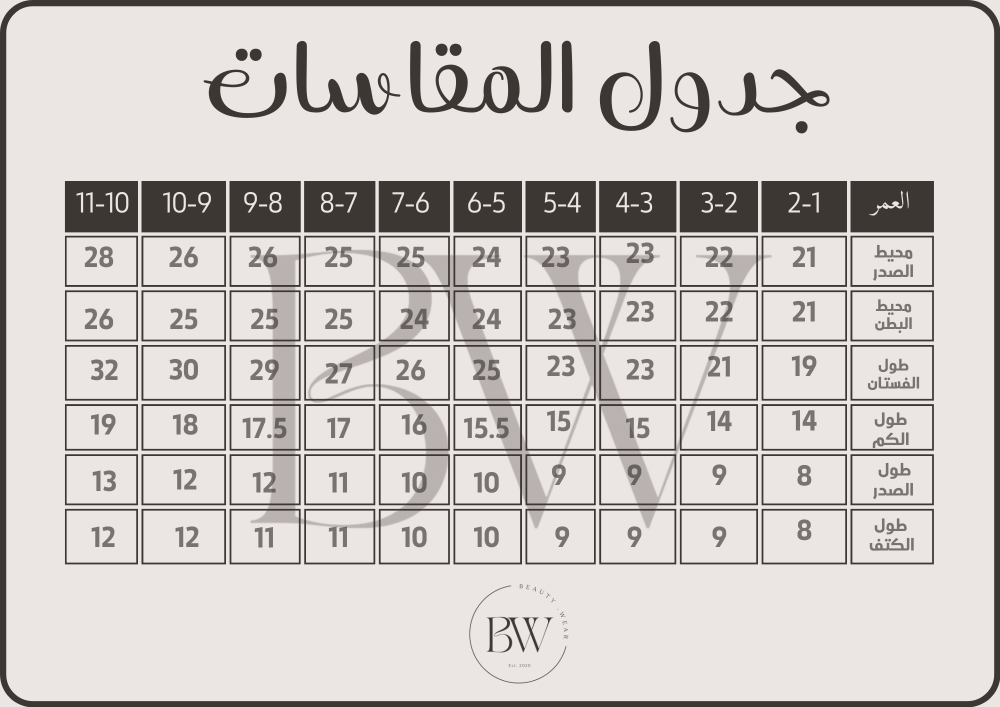 - المقاسات العالمية هي المعتمدة لدينا، وبإمكانكم التواصل مع خدمة العملاء لمزيد من التفاصيل.