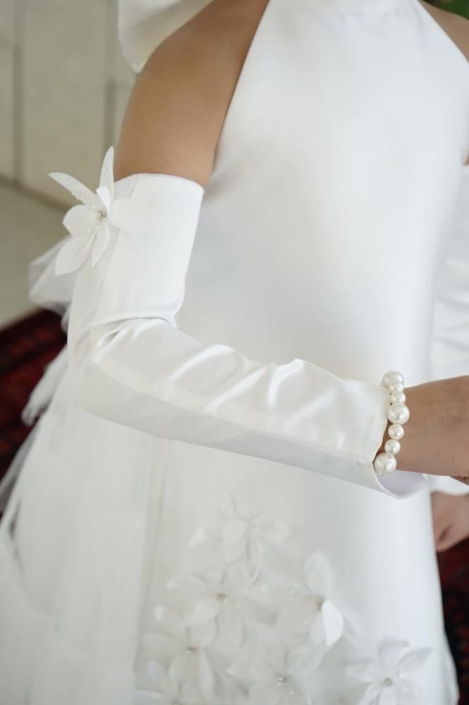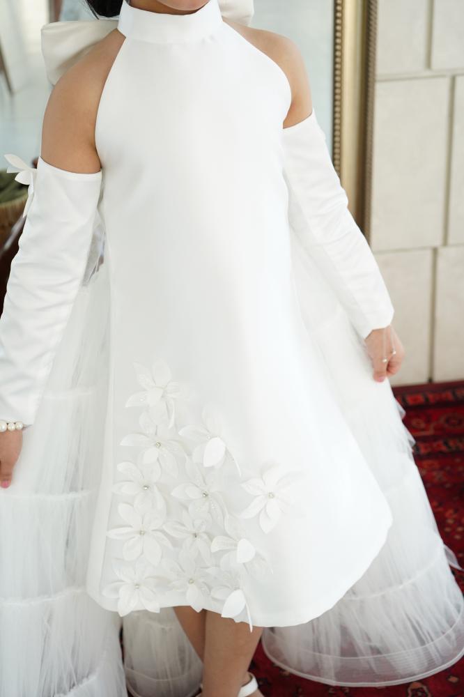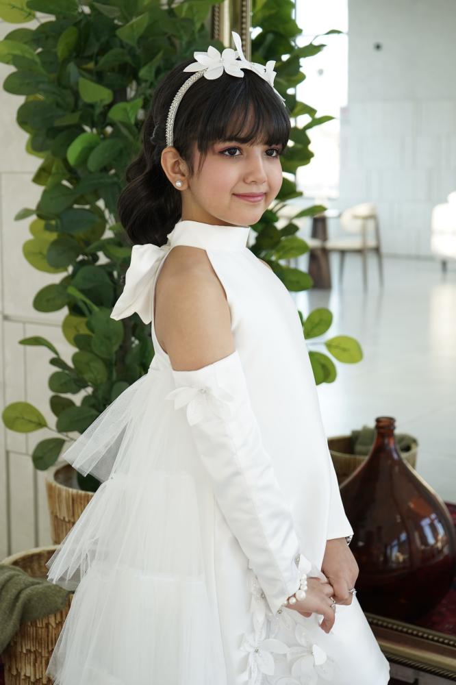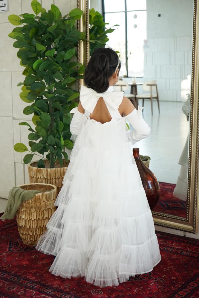 # فستان أبيض عصري يمتاز بتصميمه الأنيق بالورود وذو ذيل طويل من التل قابل للفك والتنزيل حسب احتياجك